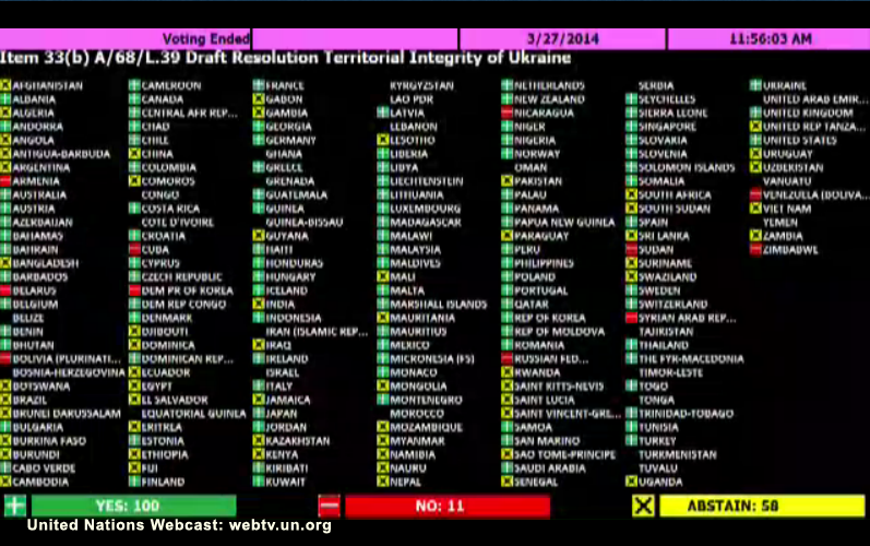 La Asamblea General de la ONU exhortó a todos los estados, organizaciones internacionales y organismos especializados a no reconocer los cambios en el estatus de Crimea y Sebastopol, y a "abstenerse de cualquier acción o medida que pueda ser interpretada como una admisión de cualquier cambio del estatus".