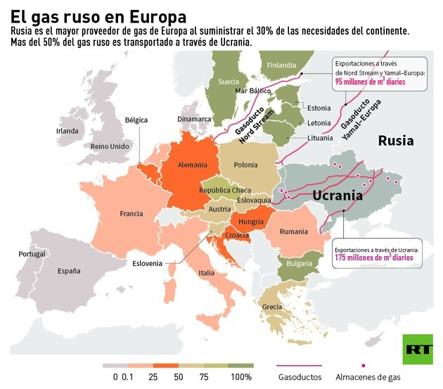 Según la cifra oficial, varios países de la UE como Letonia, Lituania, Estonia, Finlandia, Bulgaria y Chequia reciben el 100% de sus importaciones de gas desde Rusia. Para Eslovaquia, Hungría, Eslovenia, Austria, Polonia y Grecia la proporción es del 50%. En numerosas ocasiones, el gigante estatal ruso Gazprom ha asegurado que cumplirá con todos sus compromisos para seguir suministrando el gas natural al continente europeo. Sin embargo, la agencia Reuters destaca un temor general en la región ante un probable cese de suministros de gas por la confrontación política entre Rusia y Ucrania e informa que Europa ya ha elaborado un plan de contingencia ante tal posibilidad.